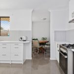 Large renovated kitchen with lots of space and storage with access to the laundry and backyard.